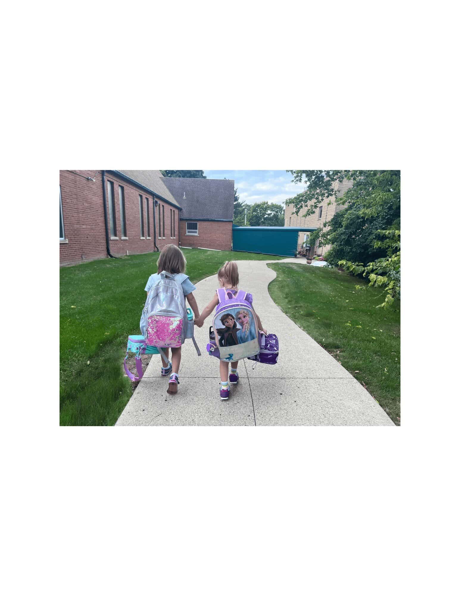 Children with backpacks walking hand-in-hand to Montessori daycare and preschool in Mount Clemens, MI.